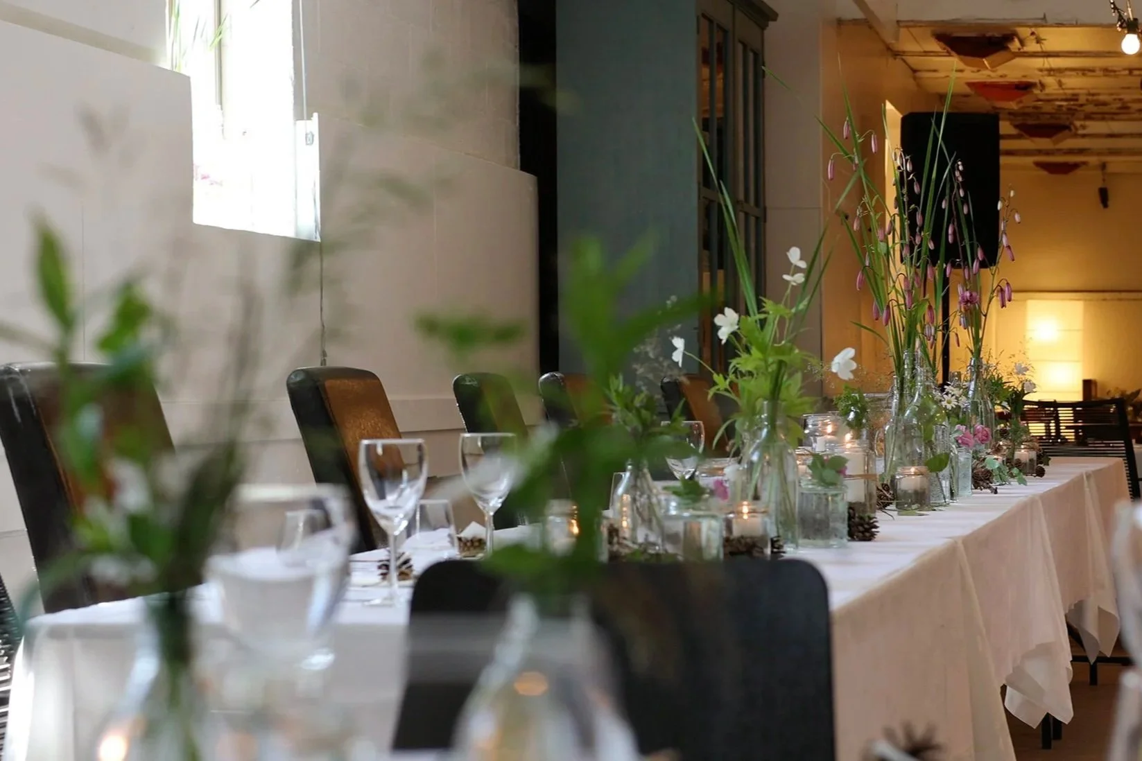 Vi dekker til gjestebud med langbord eller runde bord og dere får pynte bordene og rommet slik dere ønsker. Til kaffen gjør vi om til småbord, dekker et stort kakebord og serverer kaffe.